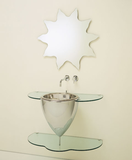 Available in several colours, white, aquamarine, violet, metallic silver, express all his elegance in the mirror chromed version, where the circular shapes exalt and reflex the light and the surrounding images.